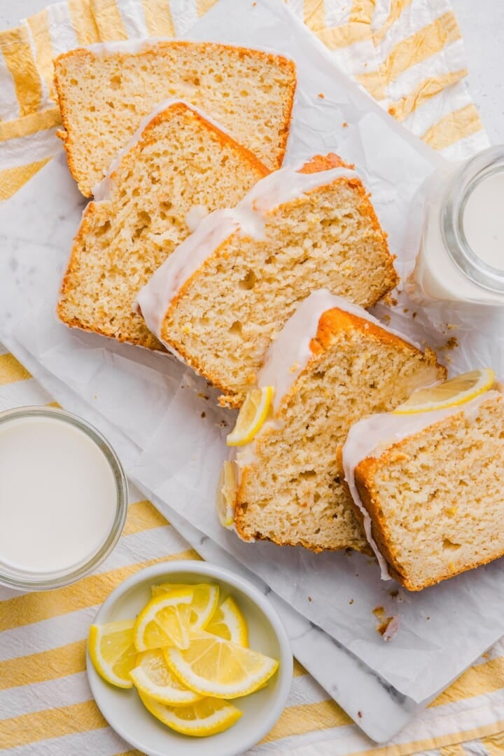 - Place your cooled loaf on a piece of parchment paper. Pour glaze over top, and spread to the edges. Let this rest for a few minutes until the glaze appears matte and set, then slice and enjoy!